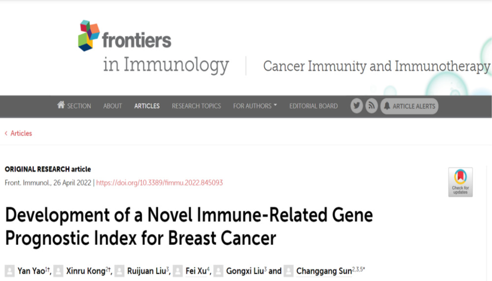 研究成果以在线论文“Development of a Novel Immune-Related Gene Prognostic Index for Breast Cancer”(DOI: 10.3389/fimmu.2022.845093)形式发表在SCI期刊《Frontiers in Immunology》(JCR一区TOP期刊,IF:7.561)。山东中医药大学博士姚燕为第一作者,孙长岗教授为本文的通讯作者,潍坊医学院中医学院、潍坊市中医院国家中医肿瘤重点专科及山东中医药大学为本文的共同通讯单位。